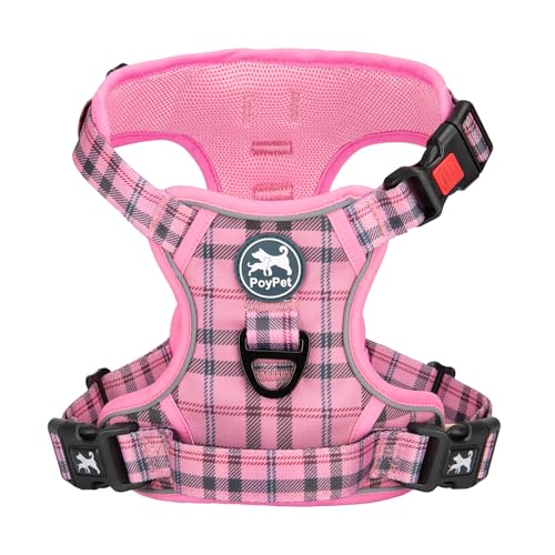 PoyPet No Pull Dog Harness, [Release on Neck] Reflective Adjustable No Choke Pet Vest with Front & Back 2 Leash Attachments, Soft Control Training Handle for Medium Dogs(Checkered Pink,M)