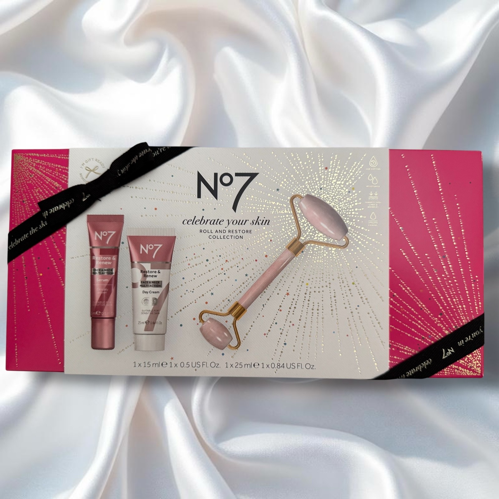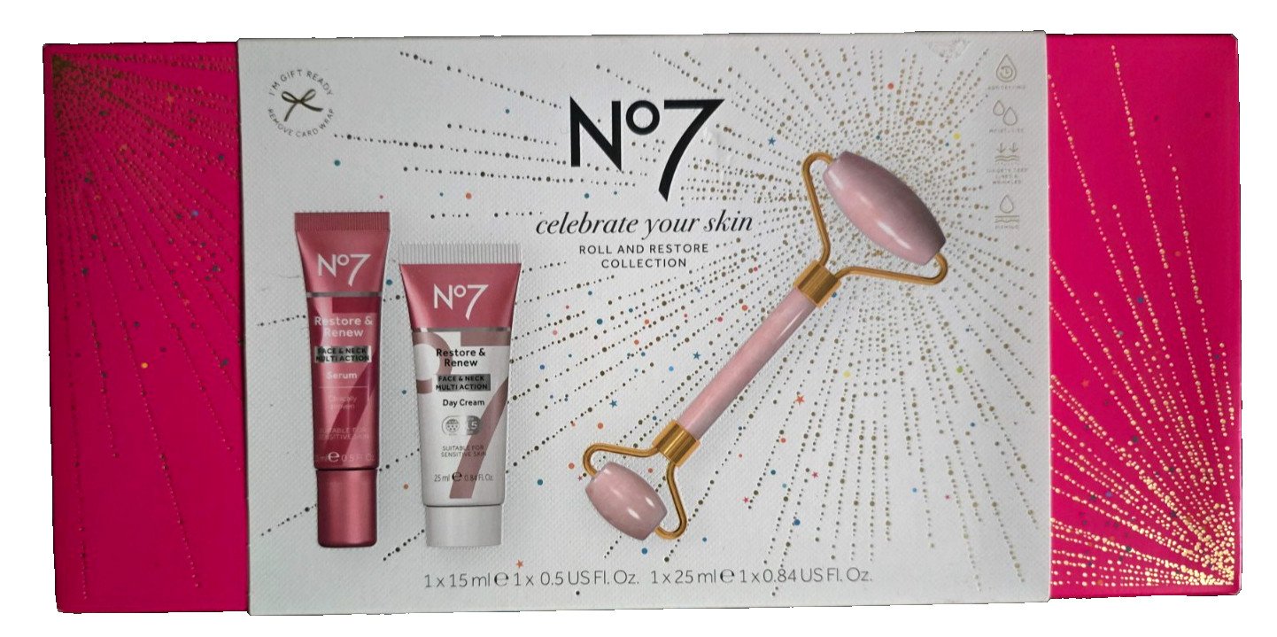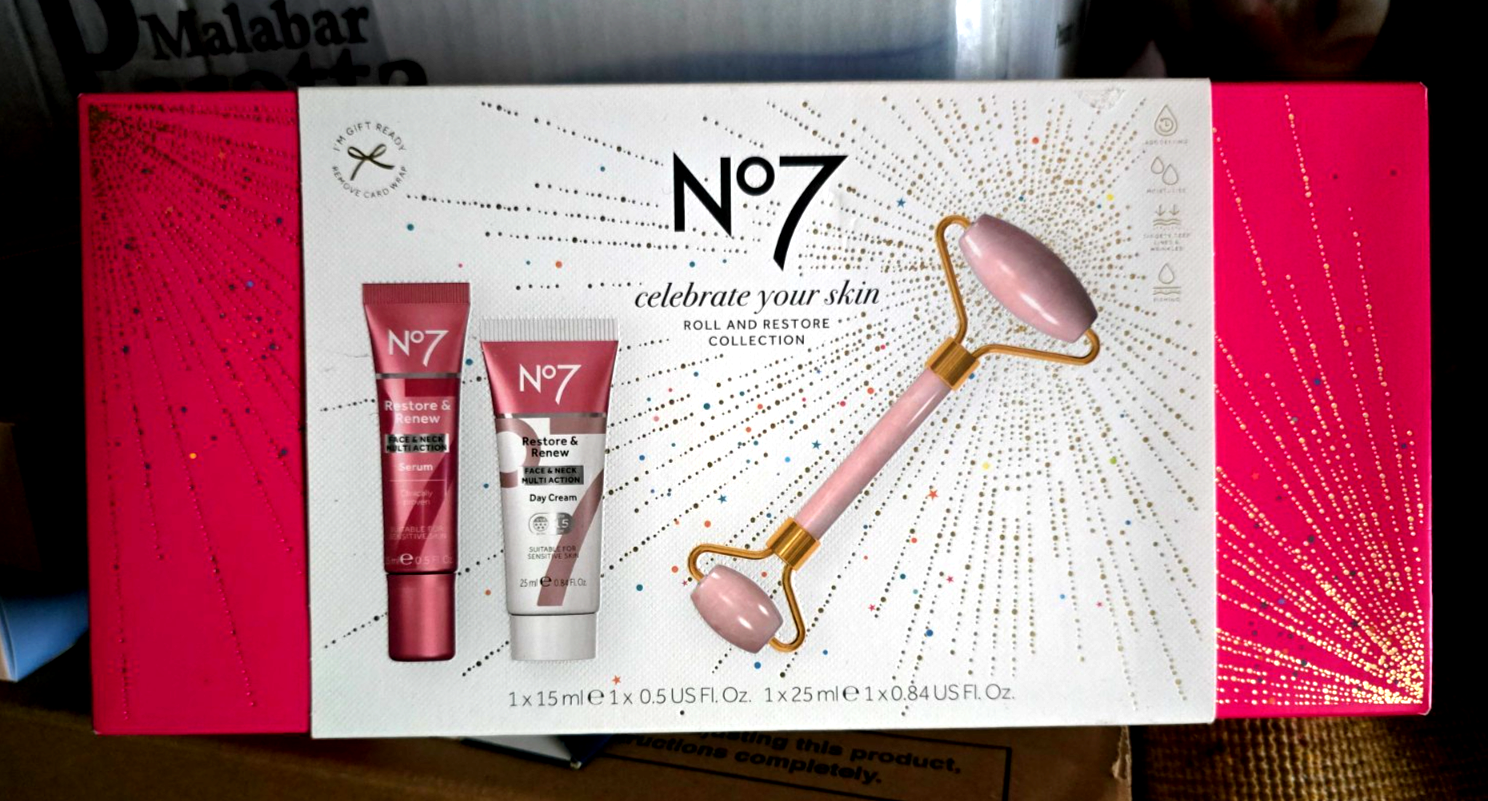 No7 ROLL AND RESTORE GIFT SET Restore & Renew Day Cream Serum Rose Quartz Roller