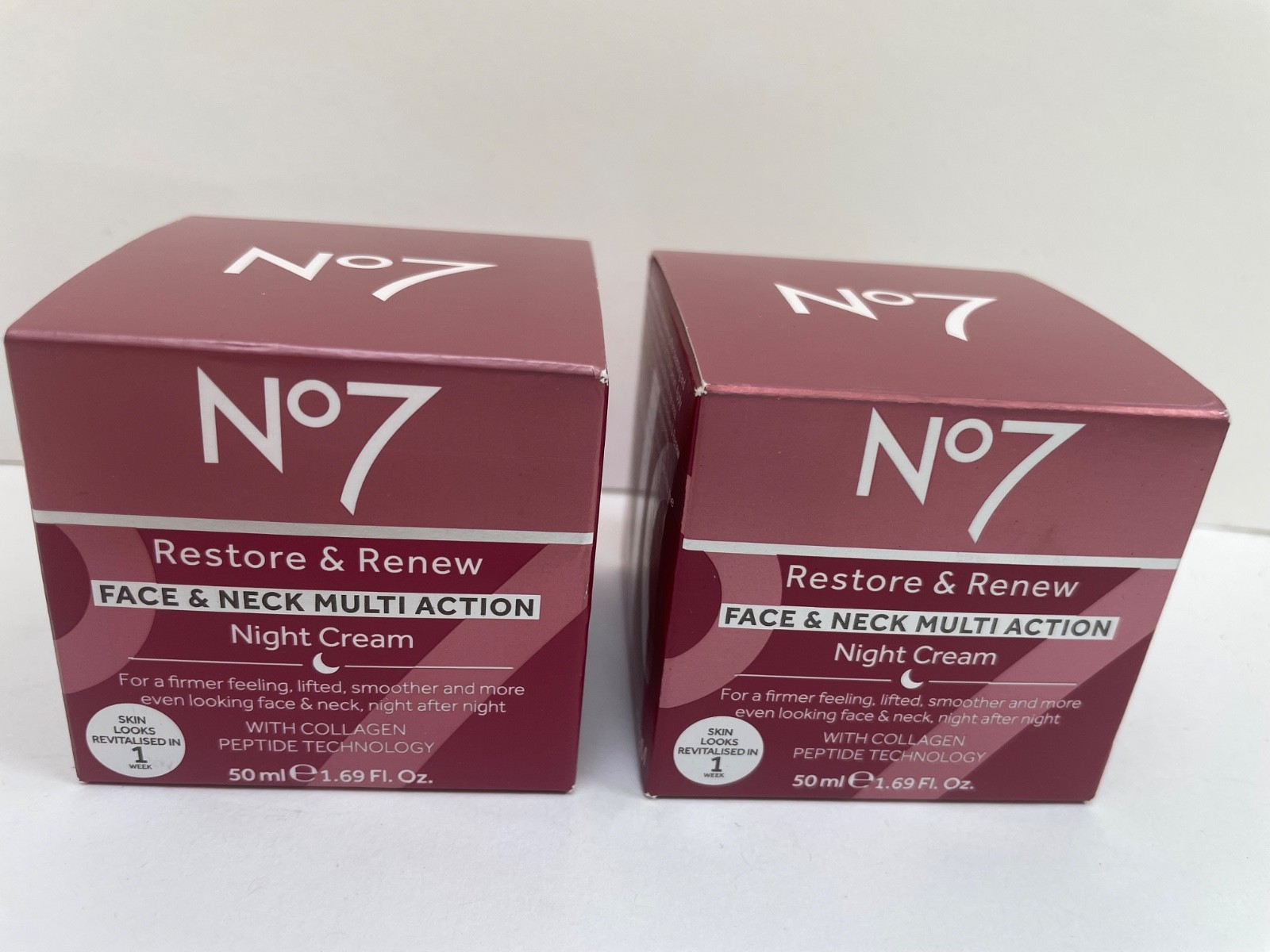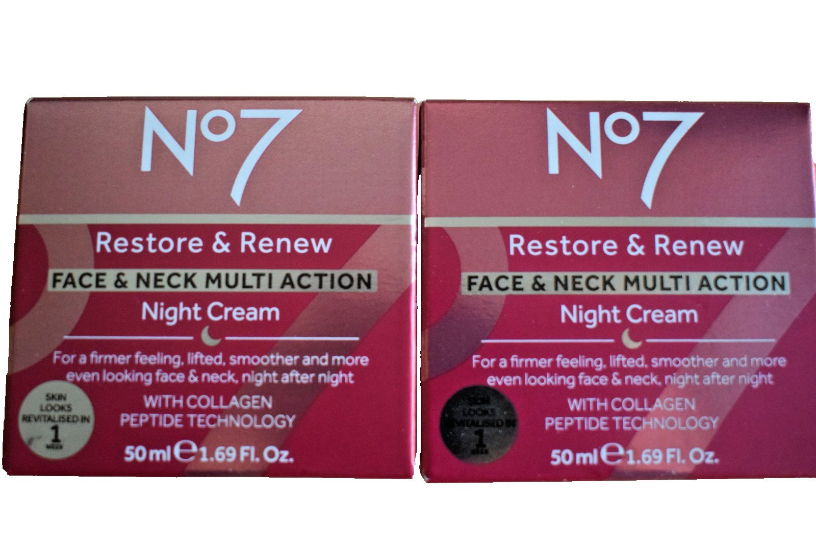 No7 Restore & Renew Face & Neck Multi Action Night Cream 2 X 50ml Full Size.