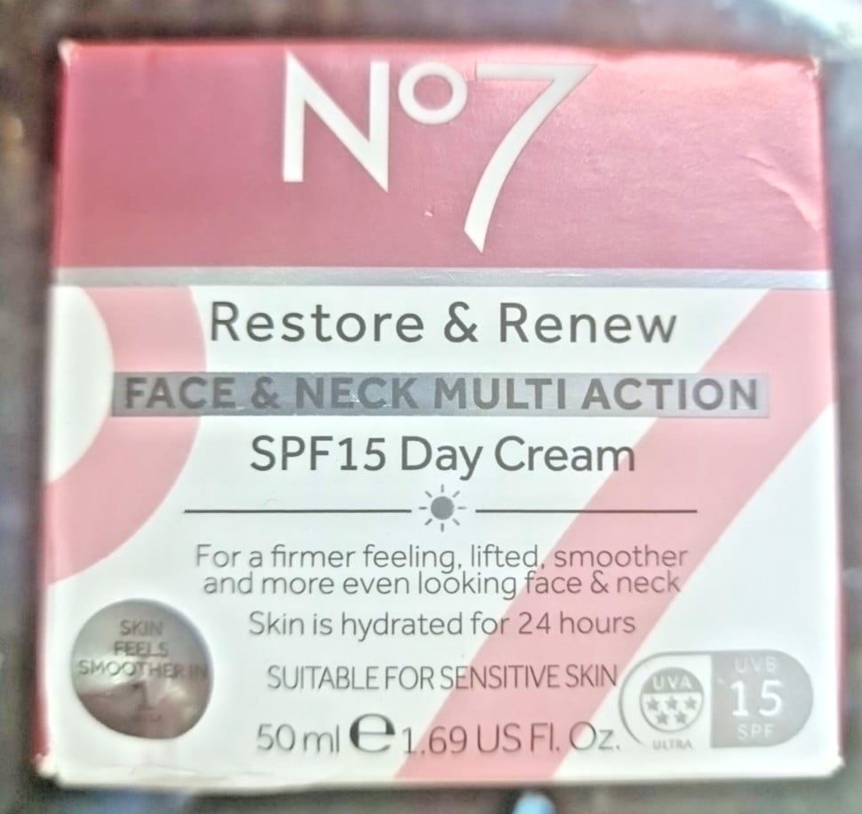 No7 Restore and Renew Face Neck Multi Action SP15 Day Cream 50ml (Brand New)