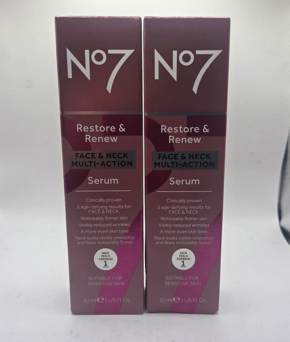 2x No7 Restore & Renew face & neck multi action Serum 50ml Brand New.