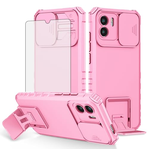 Asuwish Phone Case for Xiaomi Redmi A1/A2 with Tempered Glass Screen Protector and Slide Camera Cover Kickstand Stand Slim Protective Mobile Hard Cell Accessories Redme 1A 2A 2022 Women Men Pink