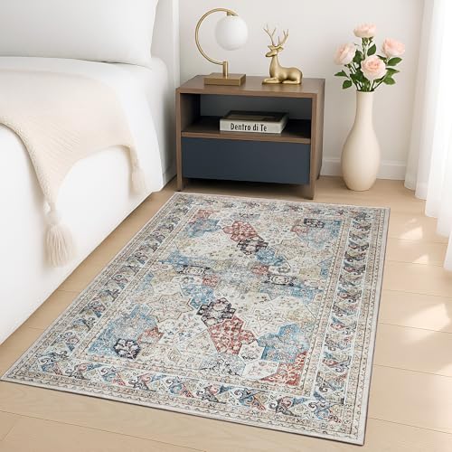 Imperial Rooms Washable Rugs Living Room Small 60x110 cm – Soft Short Pile Abstract Cream Area Rugs For Bedroom Kitchen Non Slip Carpet Bedside Rug Traditional Vintage Boho Cashmere Rug, Coastal