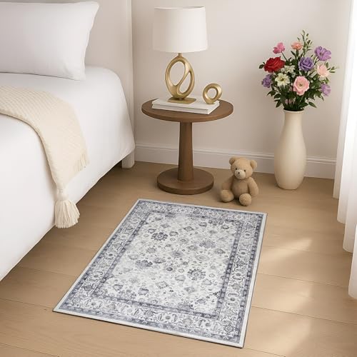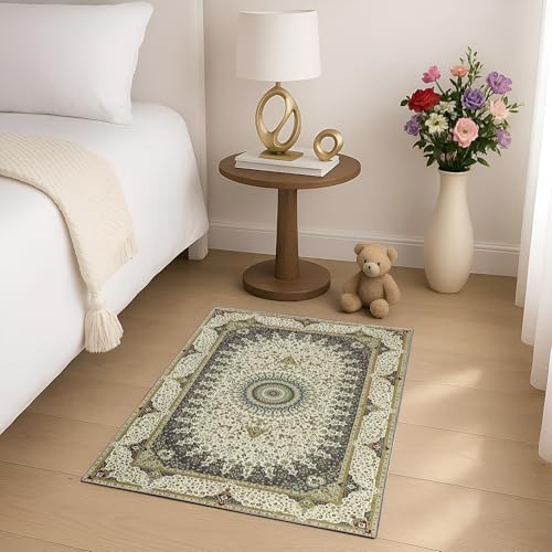 Imperial Rooms Washable Rugs Living Room Small 60x110 cm – Soft Short Pile Grey Area Rugs For Bedroom, Kitchen Non Slip Carpet Bedside Rug Traditional Design Vintage Boho Cashmere Rug, Serene