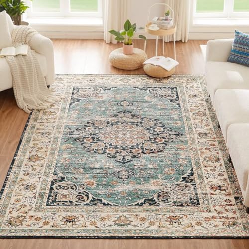 Imperial Rooms Machine Washable Rugs Living Room 120 x 170 cm – Soft Short Pile Large Green Area Rugs For Bedroom Non Slip Carpet Bedside Rug Traditional Design Vintage Boho Cashmere Rug, Willow