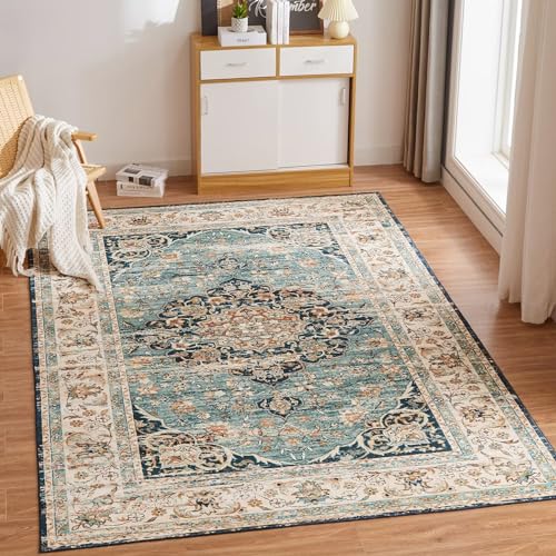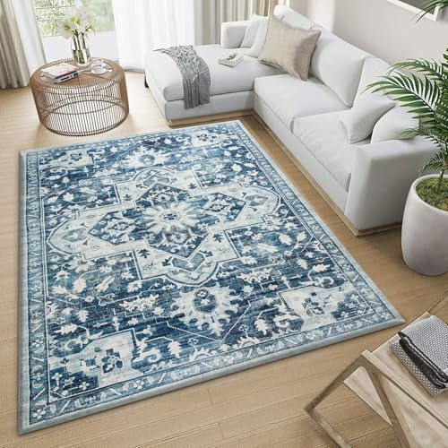 CHOSHOME Machine Washable Rugs for Living Room Large Vintage Area Rugs for Bedroom Soft Short Pile Rugs Non Slip Carpet Traditional Oriental Rug for Kitchen Dining Outdoor 120x170cm Blue Faux Wool Rug