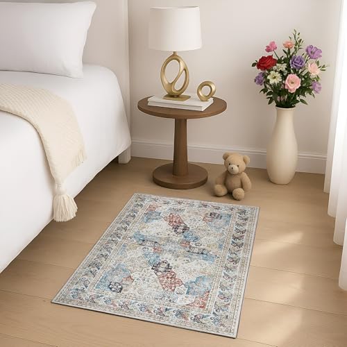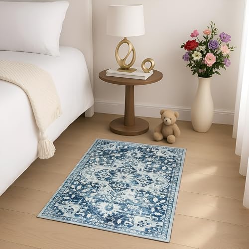 Lahome Moroccan Area Rug - 2’x3’Washable Small Entryway Accent Distressed Non-Slip Floor Carpet Rug for Door Mat Bedroom Living Room Kitchen Laundry Room Decor (2’X 3’, Blue)