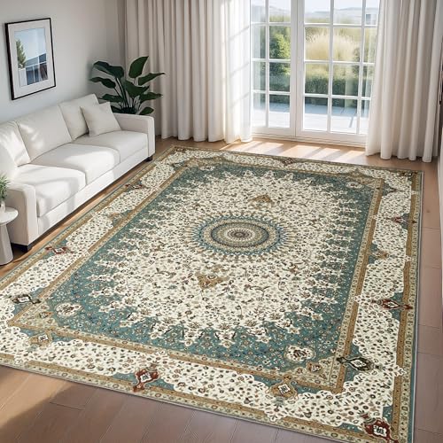 CHOSHOME Machine Washable Rugs for Living Room Large Vintage Area Rugs for Bedroom Soft Short Pile Rugs Non Slip Carpet Traditional Oriental Rug for Kitchen Dining Outdoor 200x290cm Blue Faux Wool Rug