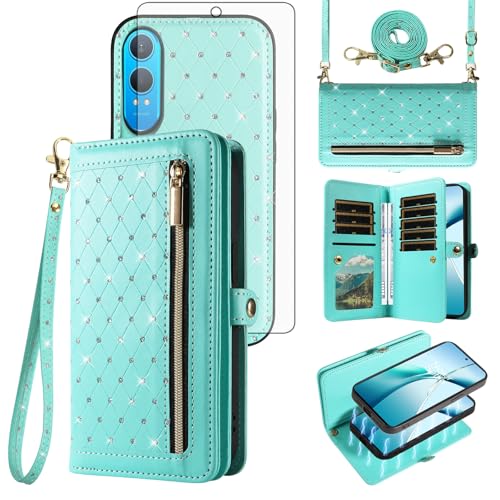 Phone Case for OnePlus Nord CE4 Lite 5G Zipper Wallet Detachable Magnetic Cell Cover with Screen Protector Crossbody Lanyard Strap Credit Card Holder Slots One Plus 1 1plus ce 4 4lite Women Teal