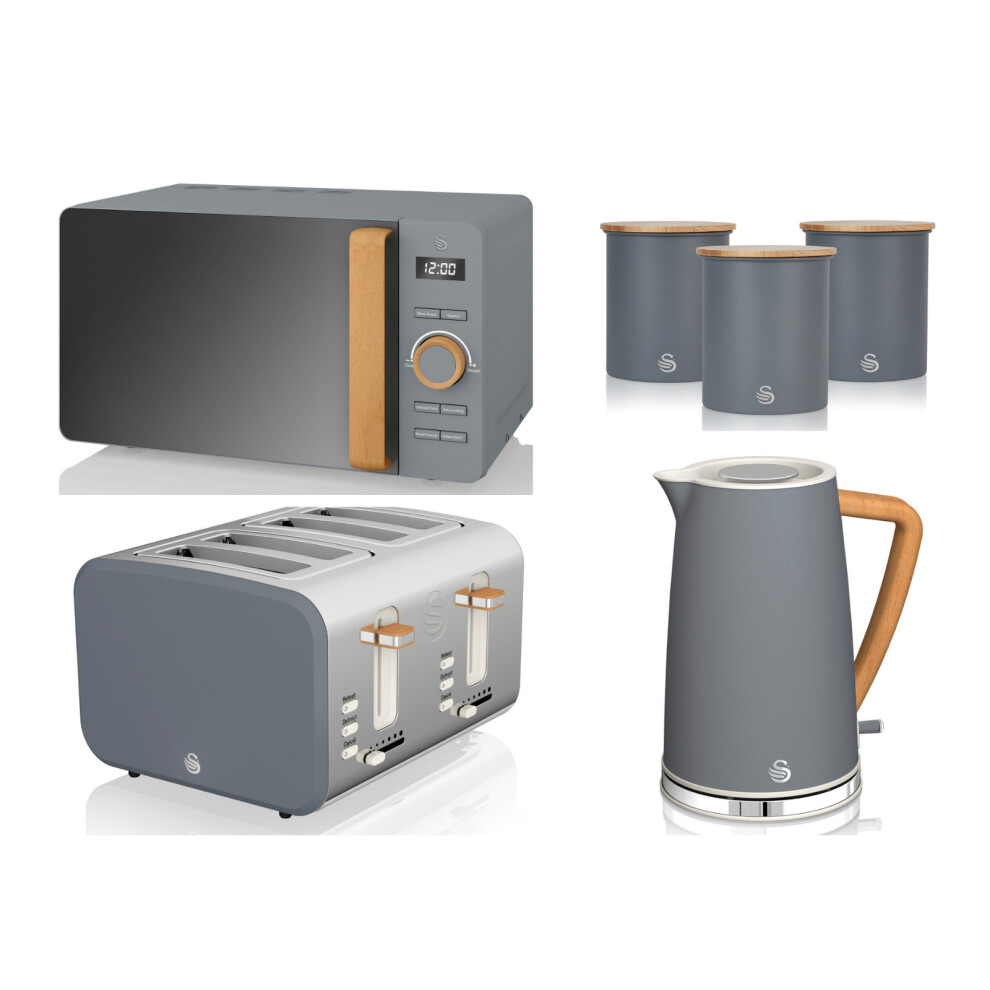 Swan Nordic Grey Kettle, 4 Slice Toaster, Microwave & Canisters Set