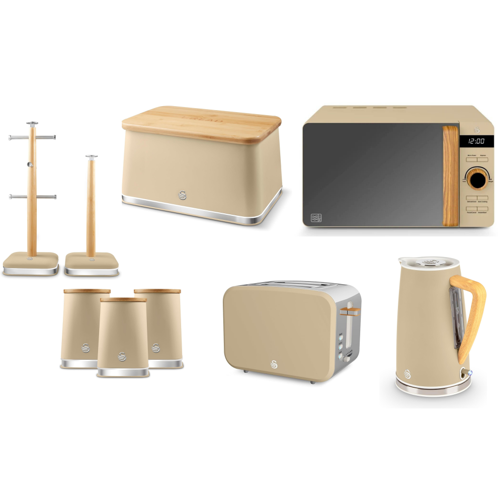 Swan Nordic Oatmeal Kettle, 4 Slice Toaster, 800W 20L Microwave, Breadbin, Canisters, Mug Tree & Towel Pole. Matching Kitchen Set of 9 with Oatmeal Matt Finish, Stainless Steel Accents and Acacia Wood
