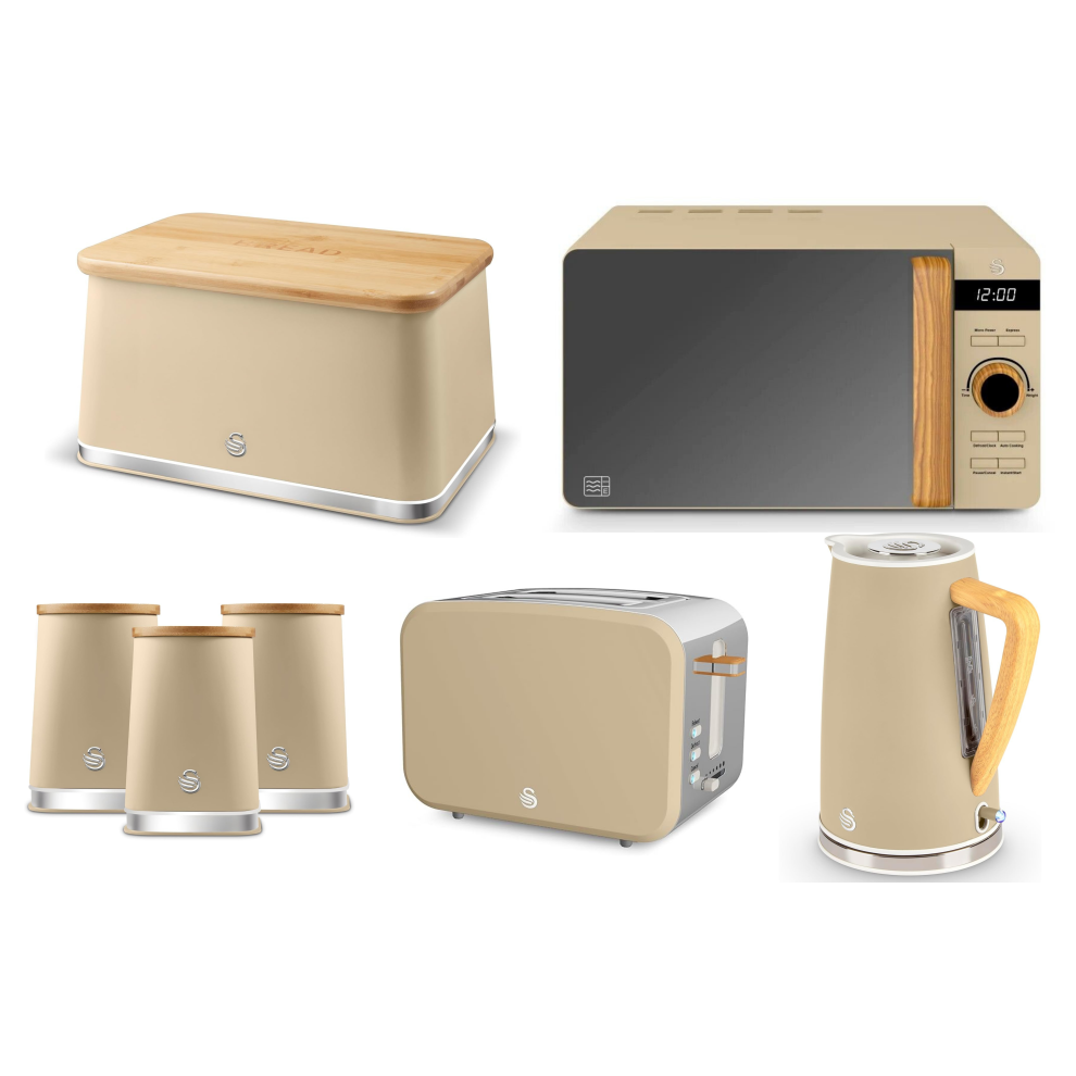 Swan Nordic Oatmeal Kettle, 2 Slice Toaster, 800W 20L Microwave, Breadbin, Canisters Set. Scandinavian Inspired Design Kitchen Set, Oatmeal Matt Finish, Stainless Steel Accents, Acacia Wood
