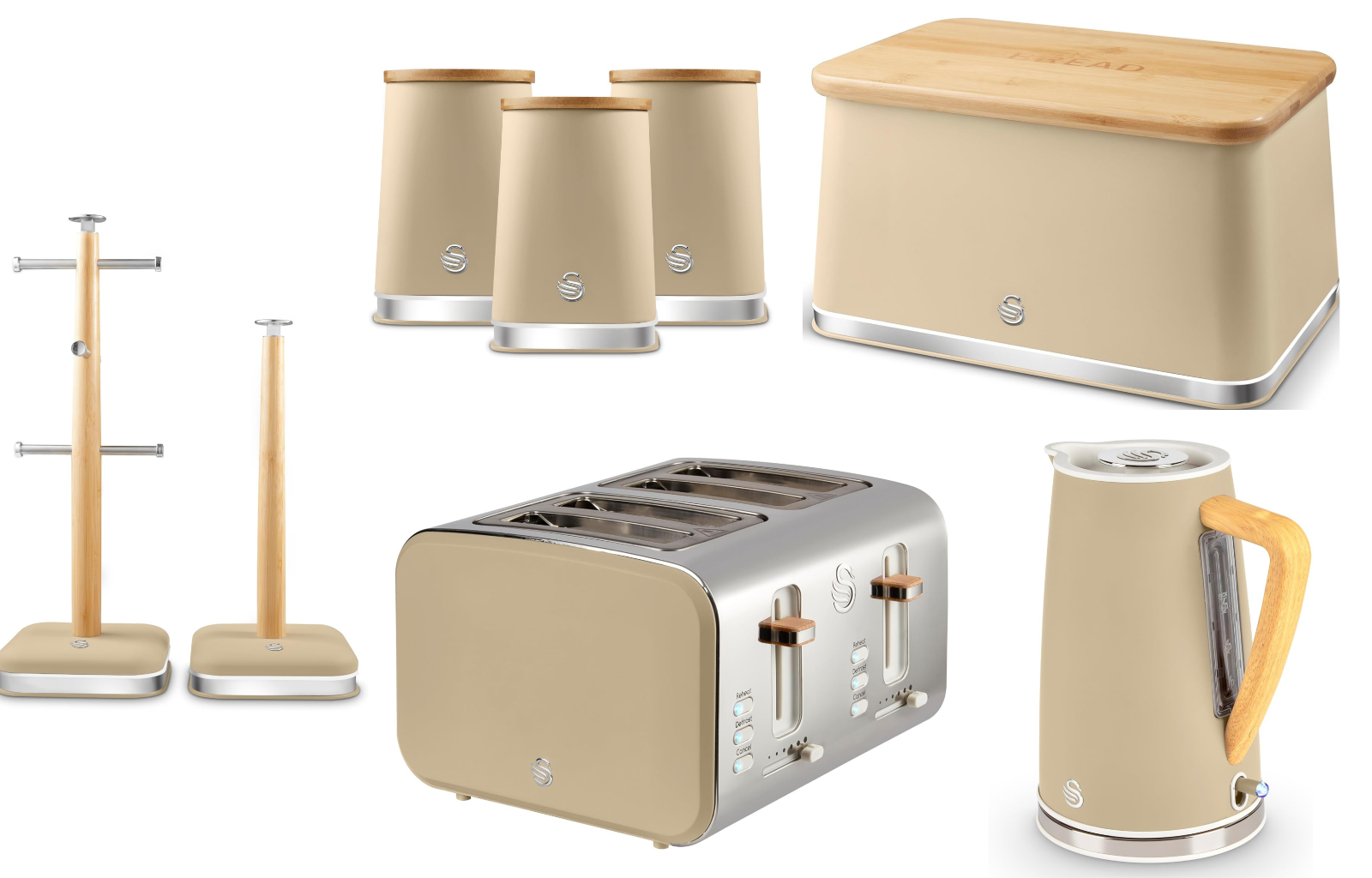 Swan Nordic Oatmeal Kettle, 4 Slice Toaster, Breadbin, Canisters, Mug Tree & Towel Pole. Matching Kitchen Set of 8 with Oatmeal Matt Finish, Stainless Steel Accents and Acacia Wood
