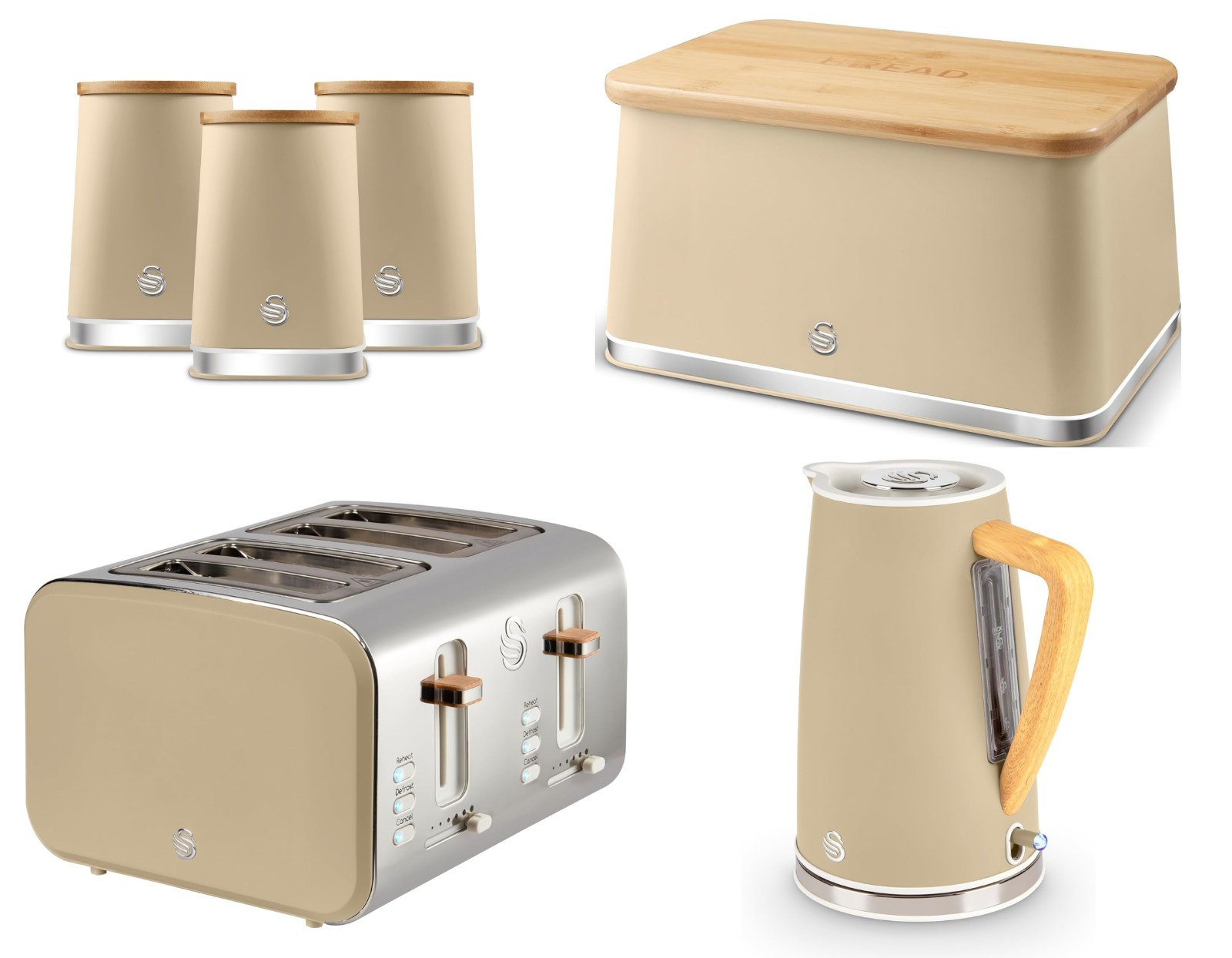 Swan Nordic Oatmeal Kettle, 4 Slice Toaster, Breadbin and Canisters. Scandinavian Inspired Design Matching Kitchen Set in Oatmeal Matt Finish, Stainless Steel Accents and Acacia Wood