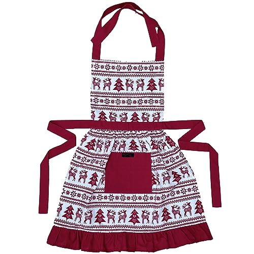 Ragged Rose Christmas Apron - Kids Aprons for Cooking & Dishwashing - Frilly Apron with Adjustable Neck Strap, Front Pocket, & Ties - Nordic Red Apron for 3-7 Years Old - 63 cm x 44 cm Cotton Apron