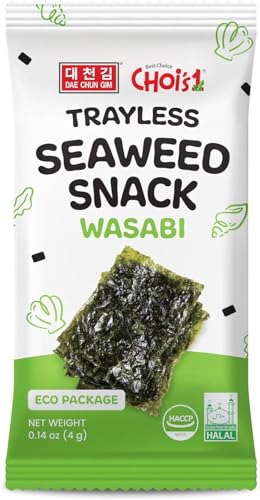 Choi's 1 Trayless Roasted Seaweed Snacks – Wasabi Flavor, 20 Pack (4g Each) | Trayless Eco-Friendly Nori Sheets – Spicy Japanese-Inspired Snack, Gluten-Free, Vegan, Keto-Friendly, Low-Calorie