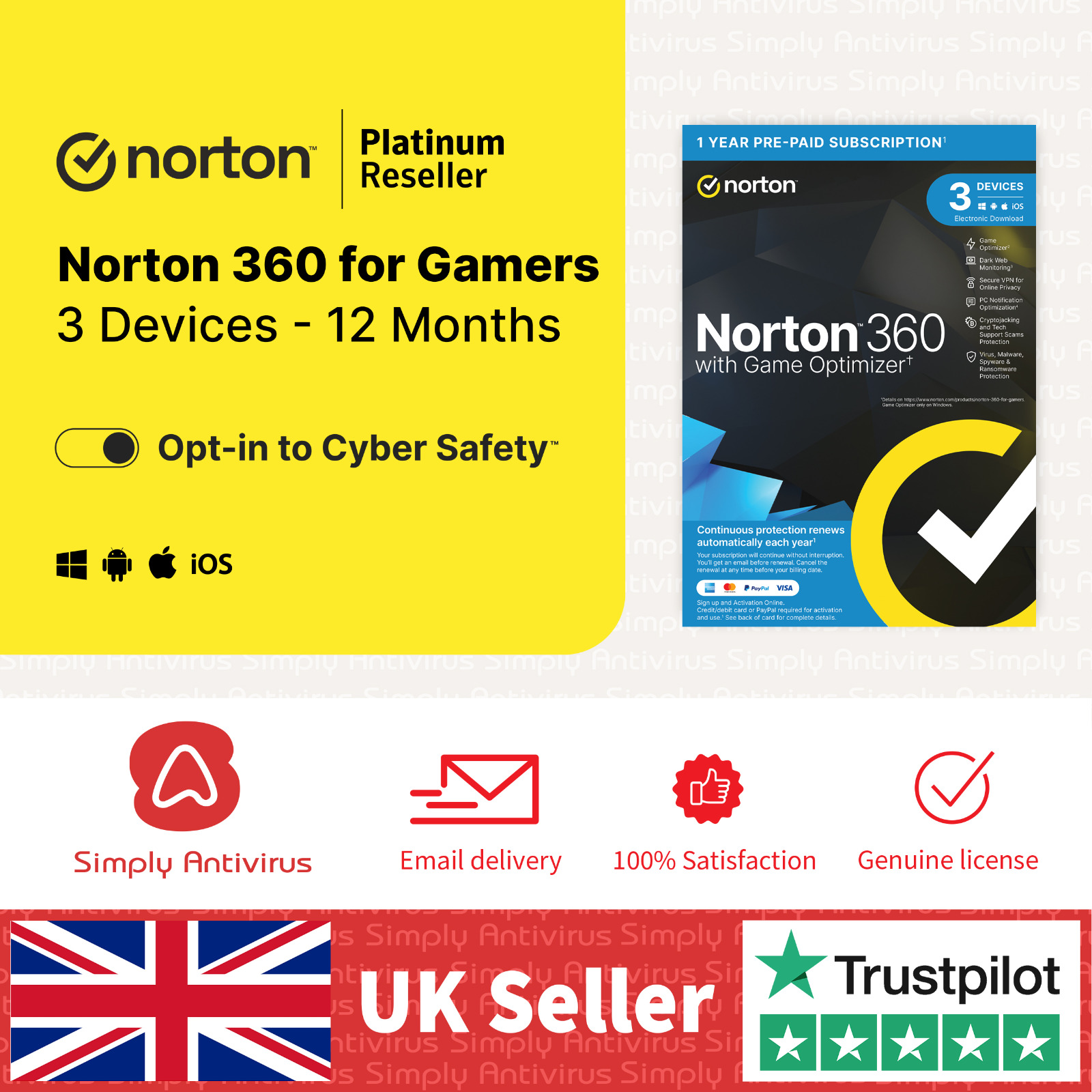 Norton 360 Gamers Antivirus 2025 3 Device 1 Year 5 Minute Email Delivery UK EU
