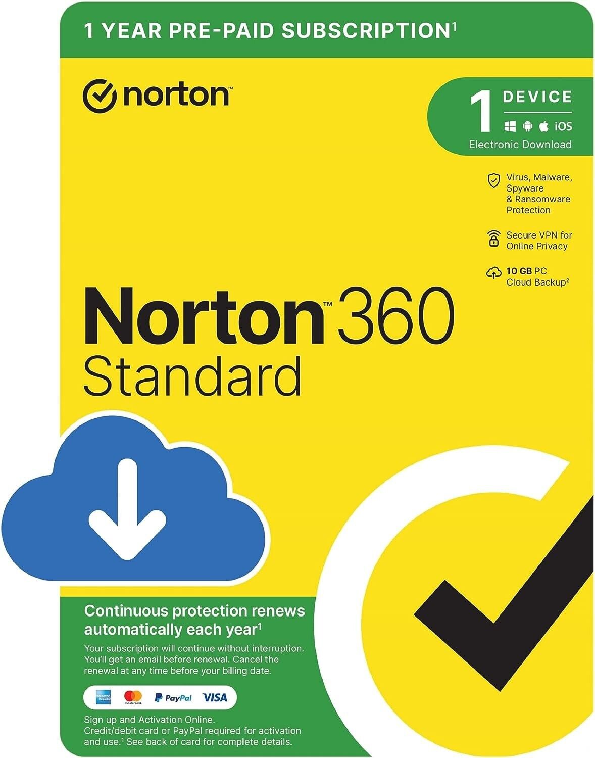 Norton 360 Standard 2022 Antivirus Software for 1 Device 1-year Subscription Includes Secure VPN Password Manager and 10GB of Cloud Storage PC/Mac/iOS/Android Activation Code by email - ESD