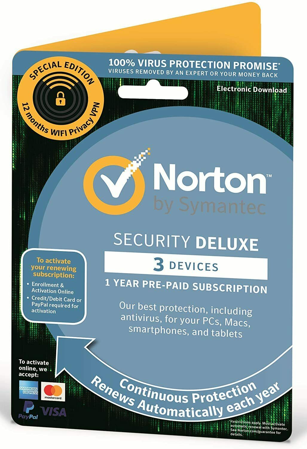 Norton Security Deluxe 2023 and Wifi Privacy |1 Year|3 Device|PC/Andriod/Mac/iPhones/iPads|Activation Code by Post