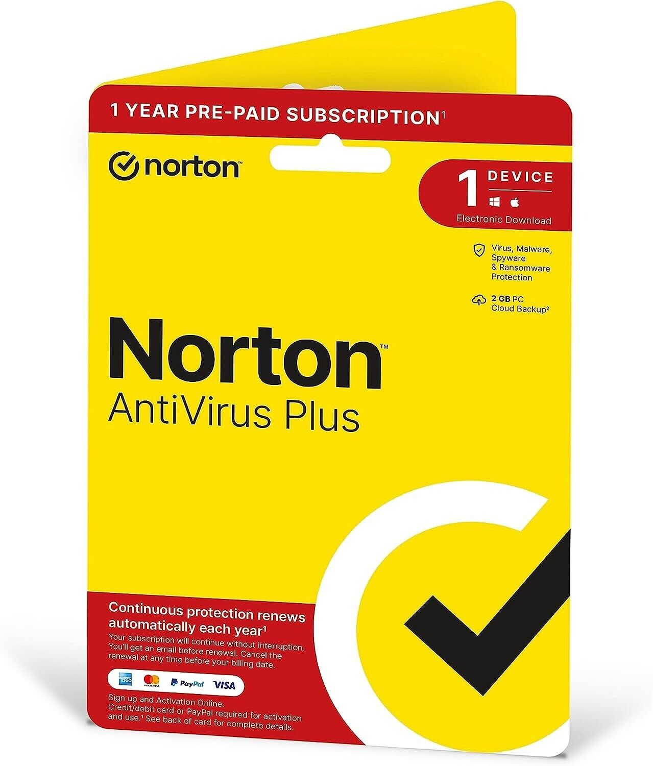 Norton AntiVirus Plus | 1 Device | 1 Year Subscription with Automatic Renewal | 2 GB Cloud Backup | PC/Mac | Password Manager