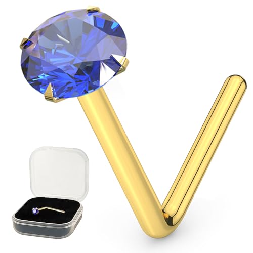 AZARIO LONDON 9K Yellow Gold Nose Stud Claw Set 2.5MM Blue Sapphire Round Crystal Stone 22 Gauge L Bend Nose Stud Piercing Jewellery