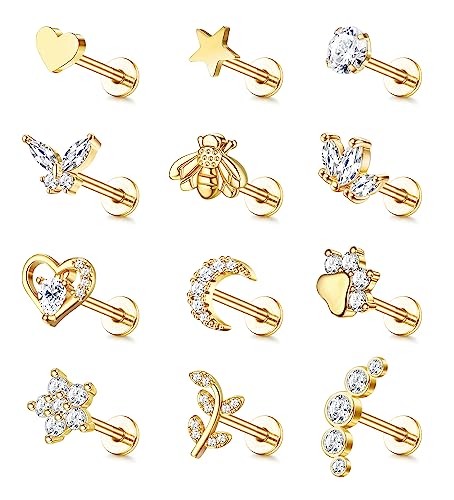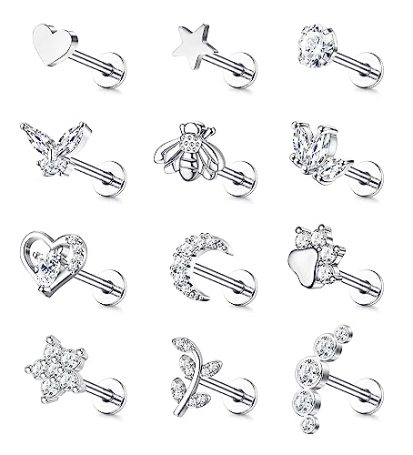 JeweBella 12Pcs 16G Cartilage Tragus Earrings for Women Men Surgical Steel Internally Threaded CZ Moon Heart Star Leaf Nose Labret Medusa Piercing Stud Tragus Helix Piercing Jewellery