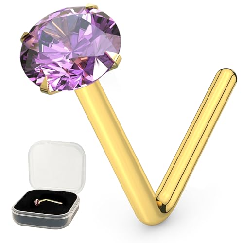 AZARIO LONDON 9K Yellow Gold Nose Stud Claw Set 1.5MM Amethyst Round Crystal Stone 22 Gauge L Bend Nose Stud Piercing Jewellery