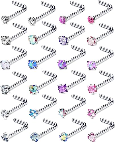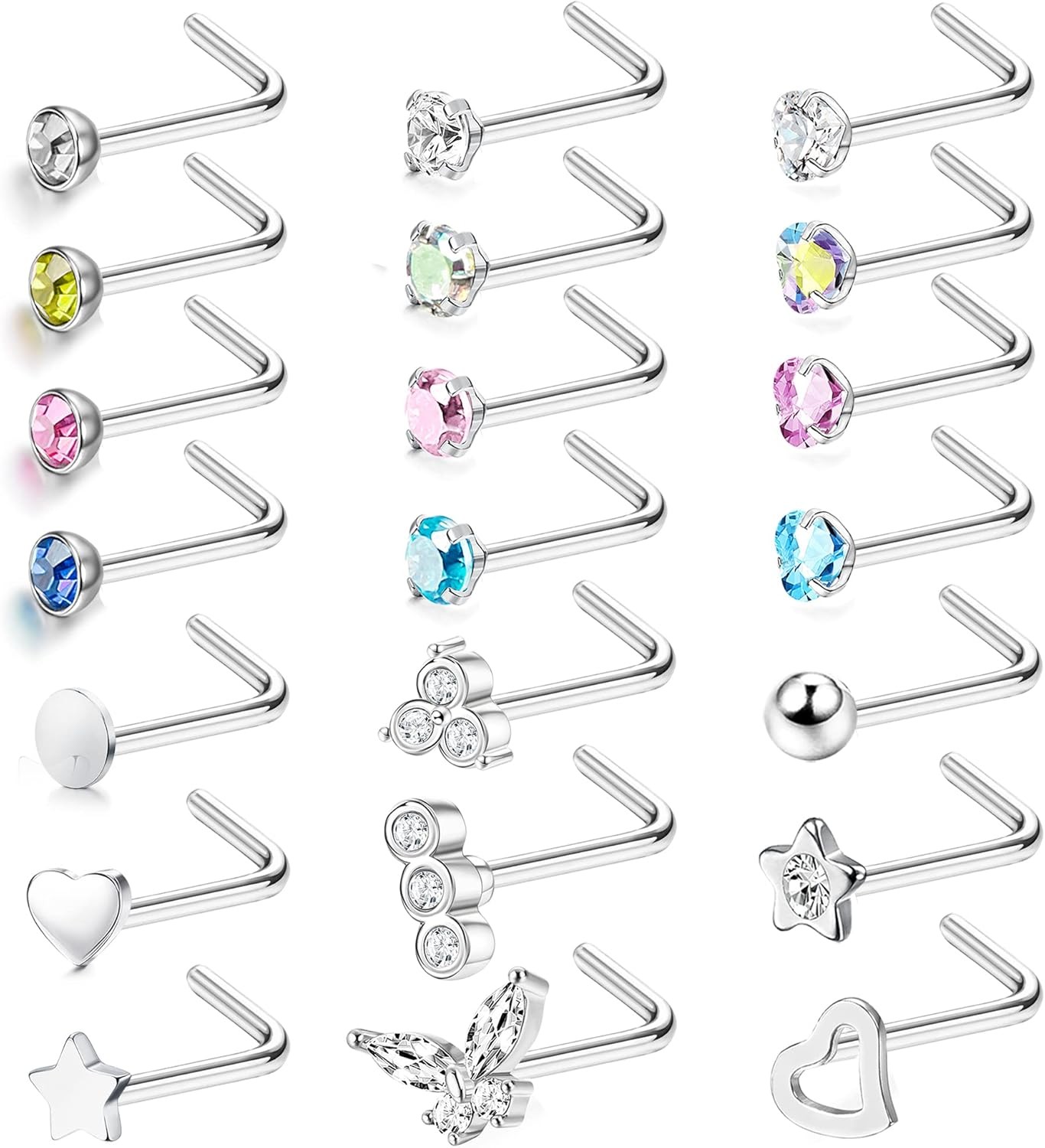 D.Bella L Shaped Nose Stud Stainless Steel Nose Rings Hoop Nose Piercings 24Pcs Nose Ring Stud Piercing Jewellery Set