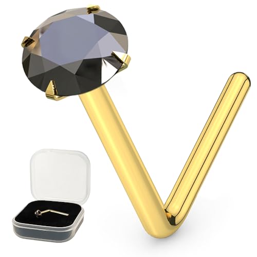 AZARIO LONDON 9K Yellow Gold Nose Stud Claw Set 1.5MM Black Round Crystal Stone 22 Gauge L Bend Nose Stud Piercing Jewellery