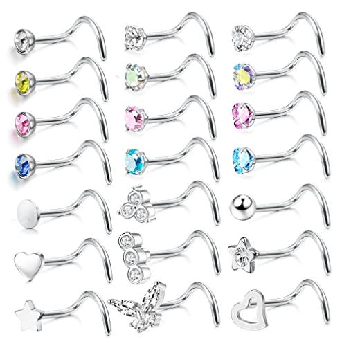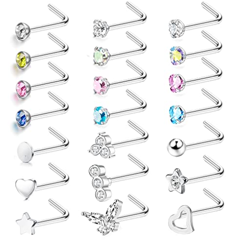 JeweBella 21 Pcs 20G Nose Stud Piercing 316L Surgical Steel for Women Men Hypoallergenic Small Colorful CZ Silver Nose Studs I Shaped/L Shaped/S Shaped Nose Stud Screw Nose Piercing Jewellery