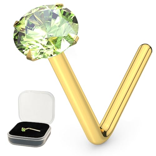 AZARIO LONDON 9K Yellow Gold Nose Stud Claw Set 2.5MM Peridot Green Round Crystal Stone 22 Gauge L Bend Nose Stud Piercing Jewellery
