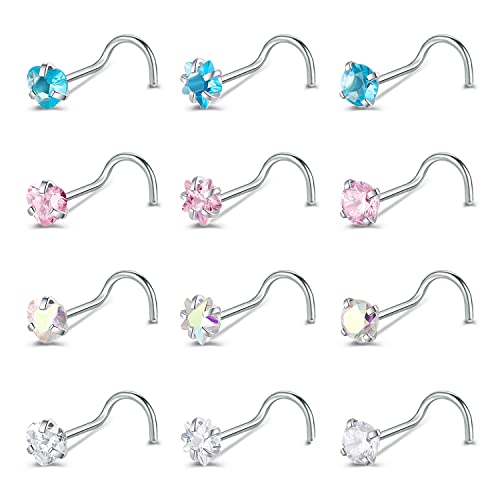 ZeSen Jewelry 9-12 Pieces 20g Tiny Nose Studs L-Shape CZ Nose Bones Nose Screw Rings Set Stainless Steel Nose Piercing Stud (12pcs Nose Screws Style)