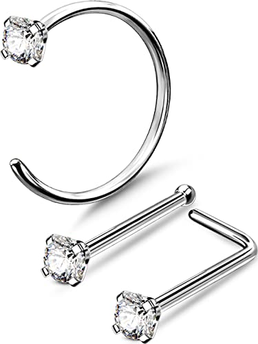 OUFER 20G 3PCS Nose Piercing Titanium G23 L-Shaped Nostril Piercing Nose Stud Clear CZ 6 mm Nose Screw Star Heart Nose Piercing Jewelry Nose Ring for Women