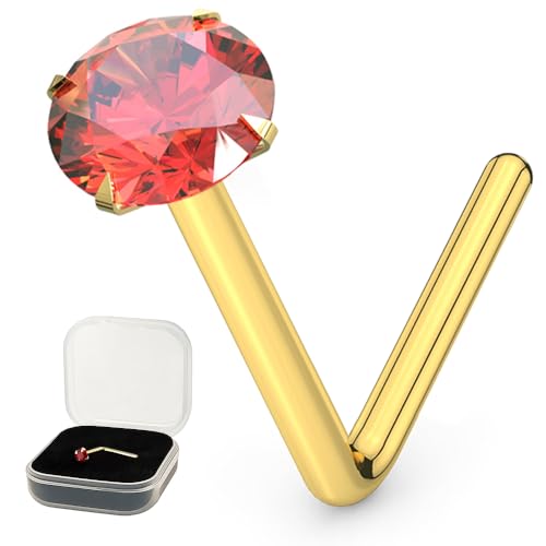 AZARIO LONDON 9K Yellow Gold Nose Stud Claw Set 2MM Red Round Crystal Stone 22 Gauge L Bend Nose Stud Piercing Jewellery