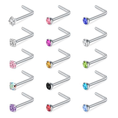 WillTen 15Pcs Nose Studs L Shape Silver, 20G Stainless Steel Cubic Zirconia Nose Ring Nose Piercing Stud, Thin Nose Bar Nostril Nose Stuf Nose Piercing Jewellery for Women Men