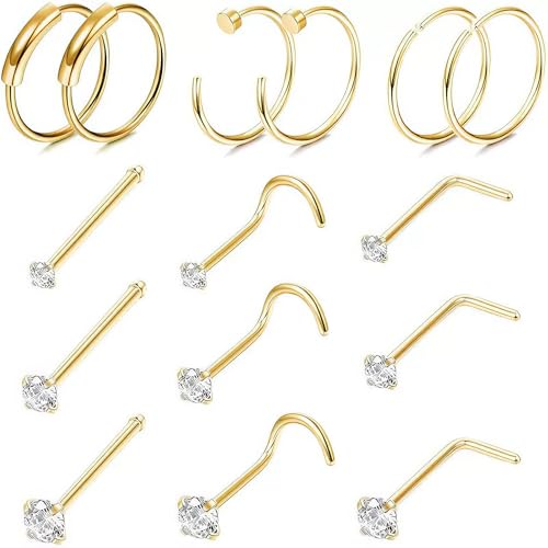 PonFxp Gold Nose Stud, 15 Pcs Gold Nose Piercing Set, Nose Stud Golds For Women And Men, Nose Piercing Jewelry For Daily Wear And Parties, 0.8x7mm Studs And 0.8x8mm Rings