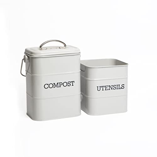 Bundle of KitchenCraft Living Nostalgia Kitchen Compost Bin, Metal, 16.5 x 12 x 24 cm, French Grey + KitchenCraft Living Nostalgia Utensils Tin, Grey, 14.5 x 16 cm