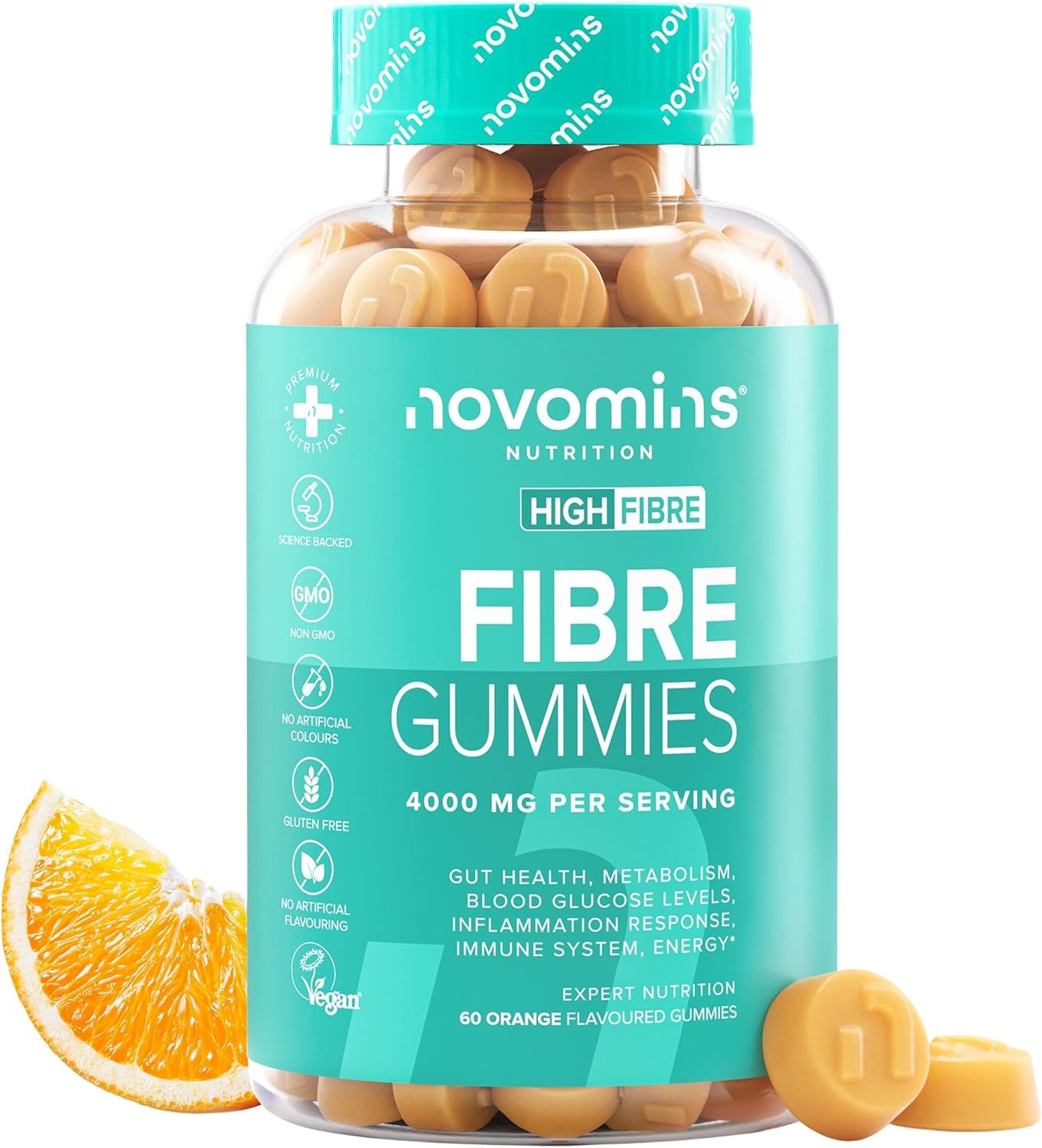 Fibre Gummies – 4000 mg High Fibre – Fibre Supplements with Calcium for Gut Health and Digestive System Support - Vitamin D, B12, Chromium and Inulin - 60 Gummies – by Novomins