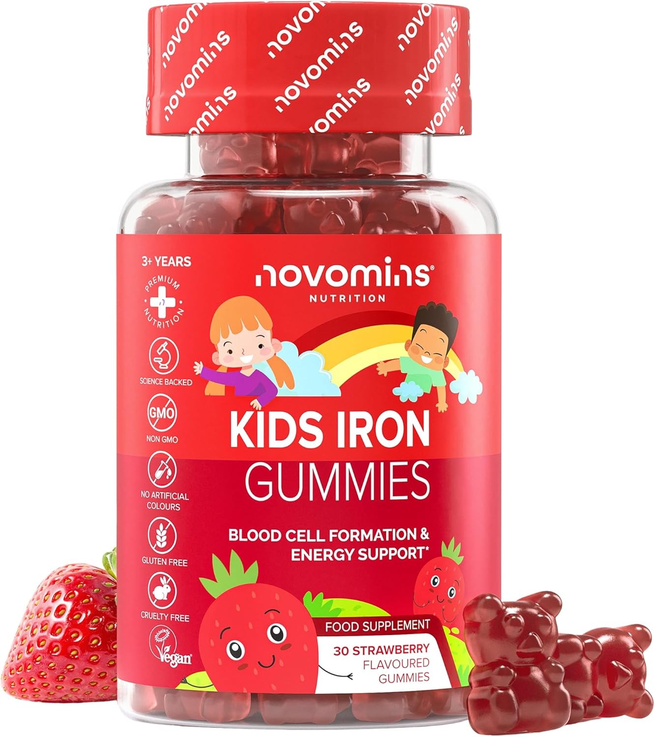 Novomins Kids Iron Gummies with Vitamin C - 30 Strawberry Gummies - Vegan Gluten