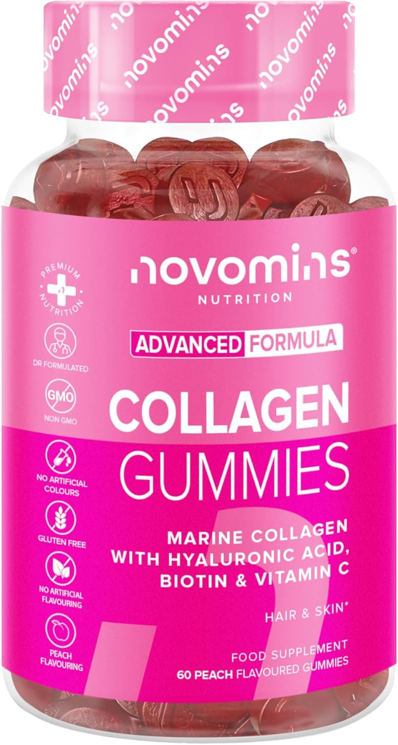 Collagen Gummies - Collagen Peptides with Hyaluronic Acid, Vitamin C & Biotin - Collagen Supplements for Women & Men - More Convenient Than Collagen Powder - 60 Marine Collagen Gummies - Novomins