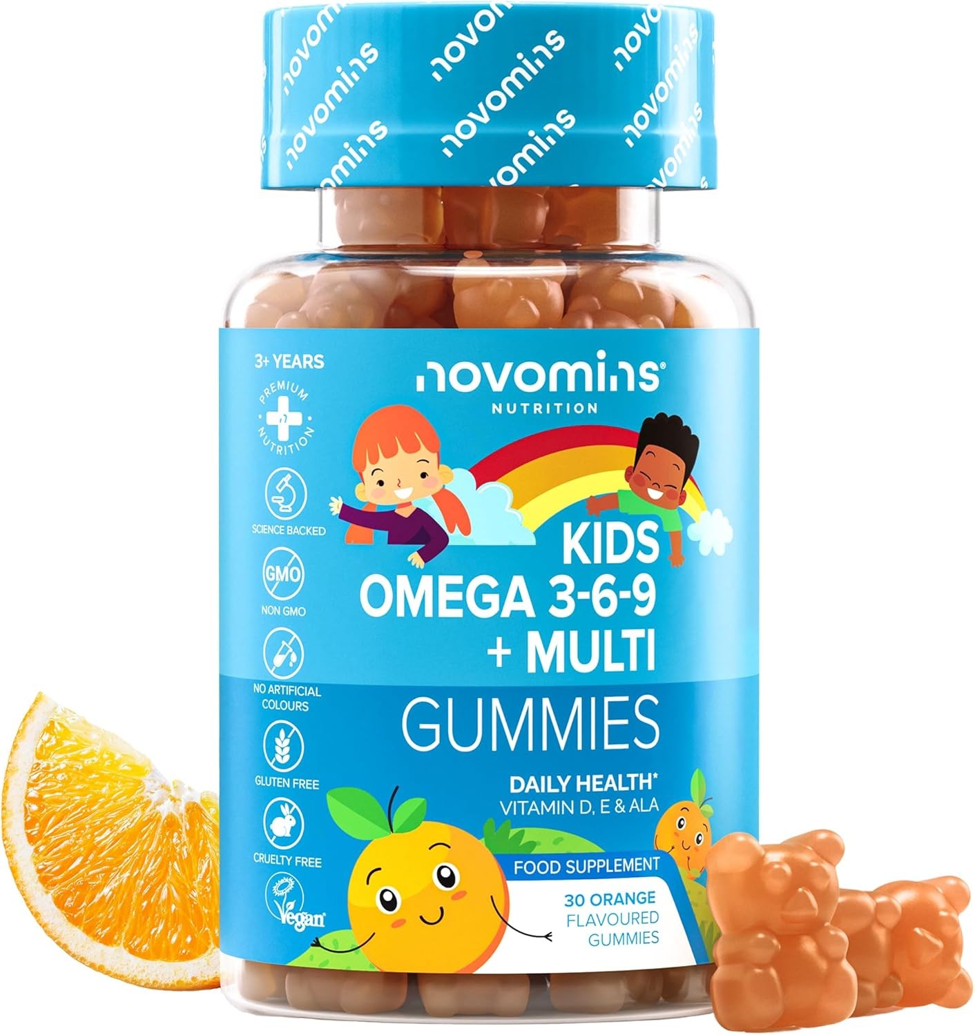 Novomins Kids Omega 3 6 9 Gummies with Vitamin D & E - 30 Vegan Orange Gummies