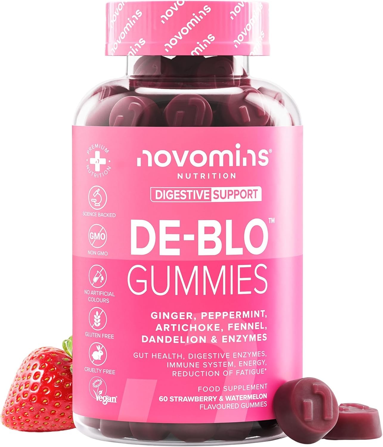 Novomins De-Blo Gummies Digestive Enzyme Supplement 60 Gummies Strawberry Waterm