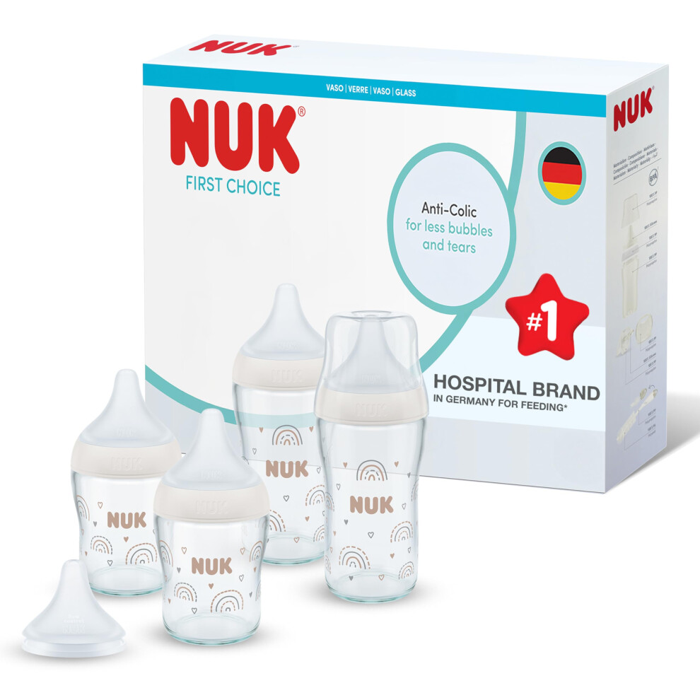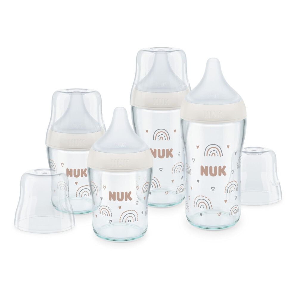 NUK Perfect Match Glass Baby Bottles Set | 6+ Months | Adapts to Baby's Palate | Temperature Control | 4 x Anti Colic Bottles & Extra Silicone Teat |