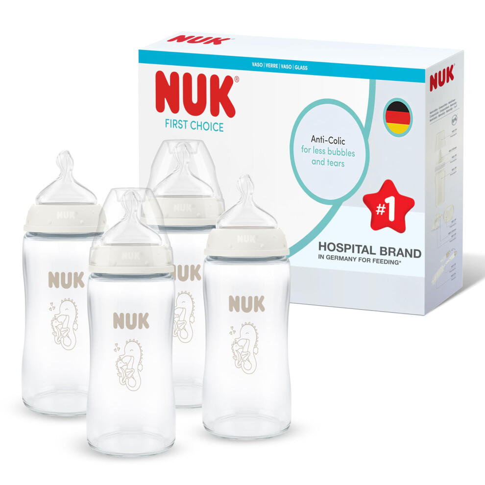 NUK First Choice Baby Bottles | 3+ Months | 240ml | Anti Colic Feeding Bottle | Glass | Temperature Control Indicator | Seahorse | 4 Count