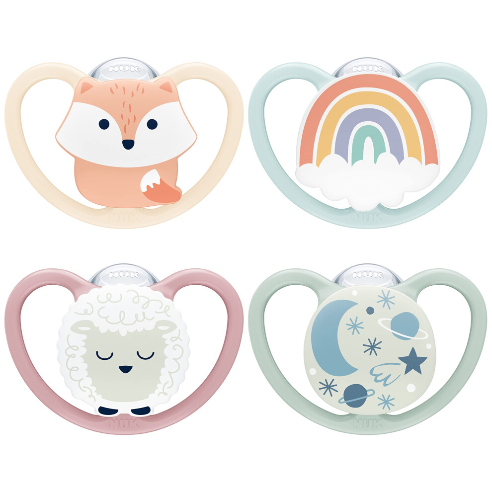 NUK Space Day & Night Baby Dummy 0-6 Months Glow-in-the-Dark Soothers with Extra Ventilation for Sensitive Skin BPA-Free Silicone Fox & Sheep 4 Count