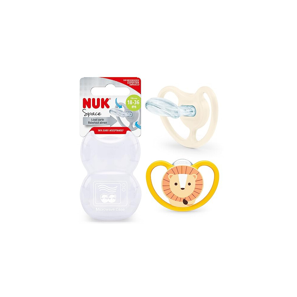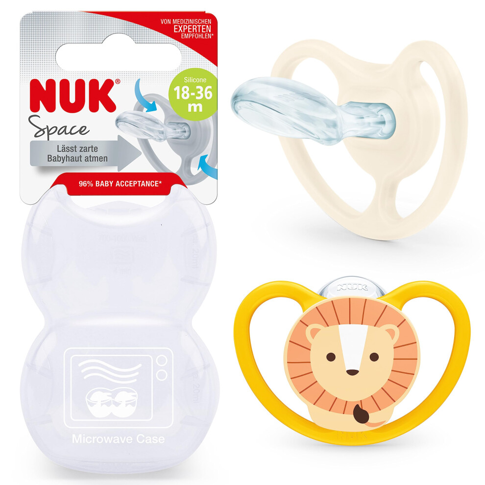 NUK Space Baby Dummy | 18-36 Months | Soothers with Extra Ventilation for Sensitive Skin | BPA-Free Silicone | Lion & Sun | 2 Count