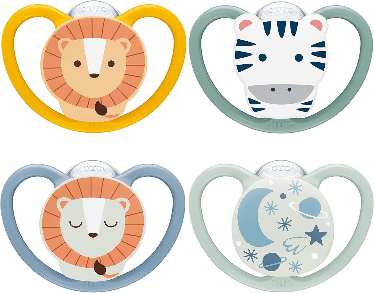 NUK Space Day & Night Baby Dummy | 18-36 Months | Glow-in-the-Dark Soothers with Extra Ventilation for Sensitive Skin | BPA-Free Silicone | Zebra & Sheep | 4 Count
