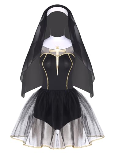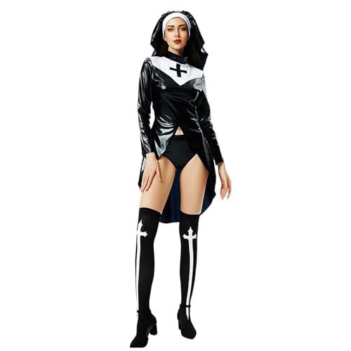AIHERQG Plus Size S-3XL Nun Costume Halloween Missionary Virgin Mary Religious Sister Suit Sexy Black White Bad Habit Cosplay Fancy Dress(Black1,XL)