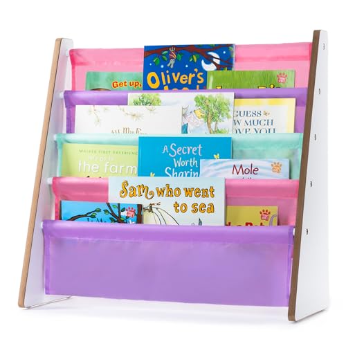 LIVIVO Colorful Kids Bookshelf - 4 Tier Children's Bookcase, Magazine and Book Storage Rack, Wooden Sling Book Organizer, Book Shelf for Kids Room, Bedroom, Nursery, Playroom (Pinks)