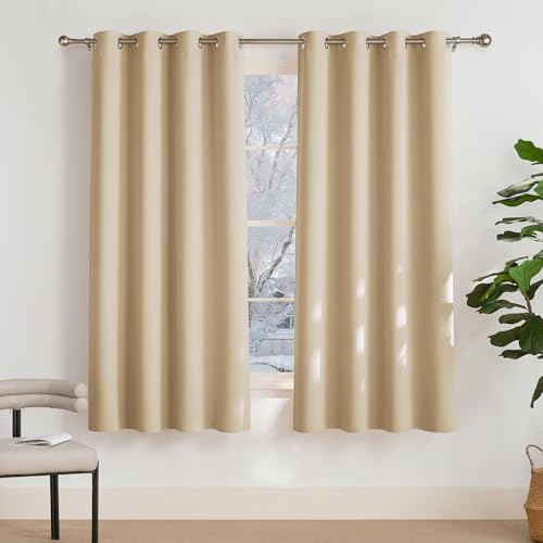 PONY DANCE Eyelet Thermal Beige Curtain with Rings - Energy Saving Privacy Protection Curtains for Room Darken 52 x 63 Inch Short Eyelet Drapes for Kids Nursery, Biscotti Beige, 1 Pair